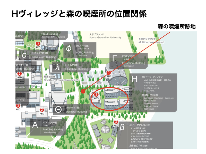 撤去に至った直接的な要因は、Ηヴィレッジへの副流煙の流入であった。図3に示すように、森の喫煙所とΗヴィレッジの距離関係は近く、2023年2月にΗヴィレッジが竣工してから、多くの学生がその周辺で生活するようになった。