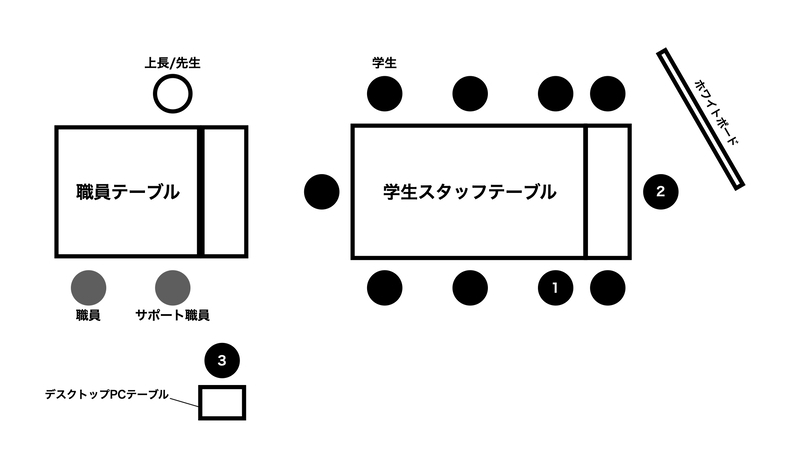 空間の側面においては、フリーアドレスの大きなテーブルのどの席に自分が座ることが多いのか、なぜその席に座ることが多いのか、誰の近くに誰が座るのかなどを活動の様子の写真をもとに記録した。浮世絵の展覧会の企画準備に追われていた5月の活動では、図右下の①の席、ホワイトボード前のお誕生日席②とデスクトップPCが置かれたひとり用テーブル席③に座ることが多かった。わたしがその席に座ることが多い理由をそれぞれのちに考えてみた。①は正面に窓があり、こちら側の席に座るとデザイン作業などでPCを使用する際に窓からの光でディスプレイが反射することがない。②はZINEのデザイン案を構想する際にメンバーへの説明や自分が考えをまとめる際にすぐにホワイトボートにかくことができる。③の席にあるデスクトップPCはデザインツールであるAdobe製品を使用する際に、大きなタッチパネル機能のついたディスプレイモニターが使いやすい。しかし、わたしだけ他の学生スタッフが座っているテーブルに背を向けて作業することになるので、テーブルでの雑談に入れなかったり、他のメンバーが何かわたしに話かける際には③の位置まできてもらっていたりした。